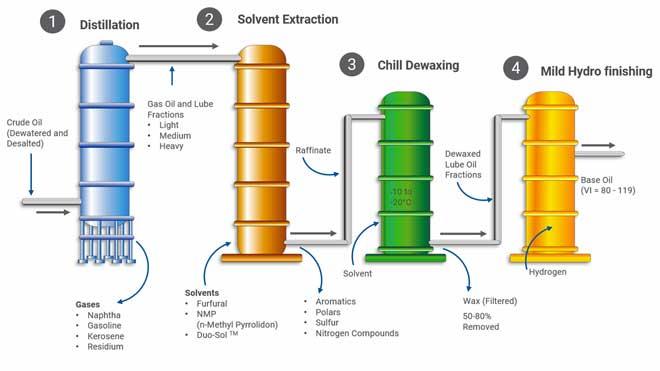 Base oil is produced by means of refining crude oil. This means that crude oil is heated in order that various distillates can be separated from one another. During the heating process, light and heavy hydrocarbons are separated – the light ones can be refined to make petrol and other fuels, while the heavier ones are suitable for bitumen and base oils.
