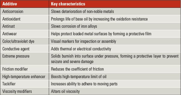Lubricant additives are organic or inorganic compounds dissolved or suspended as solids in oil. They typically range between 0.1 to 30 percent of the oil volume, depending on the machine.